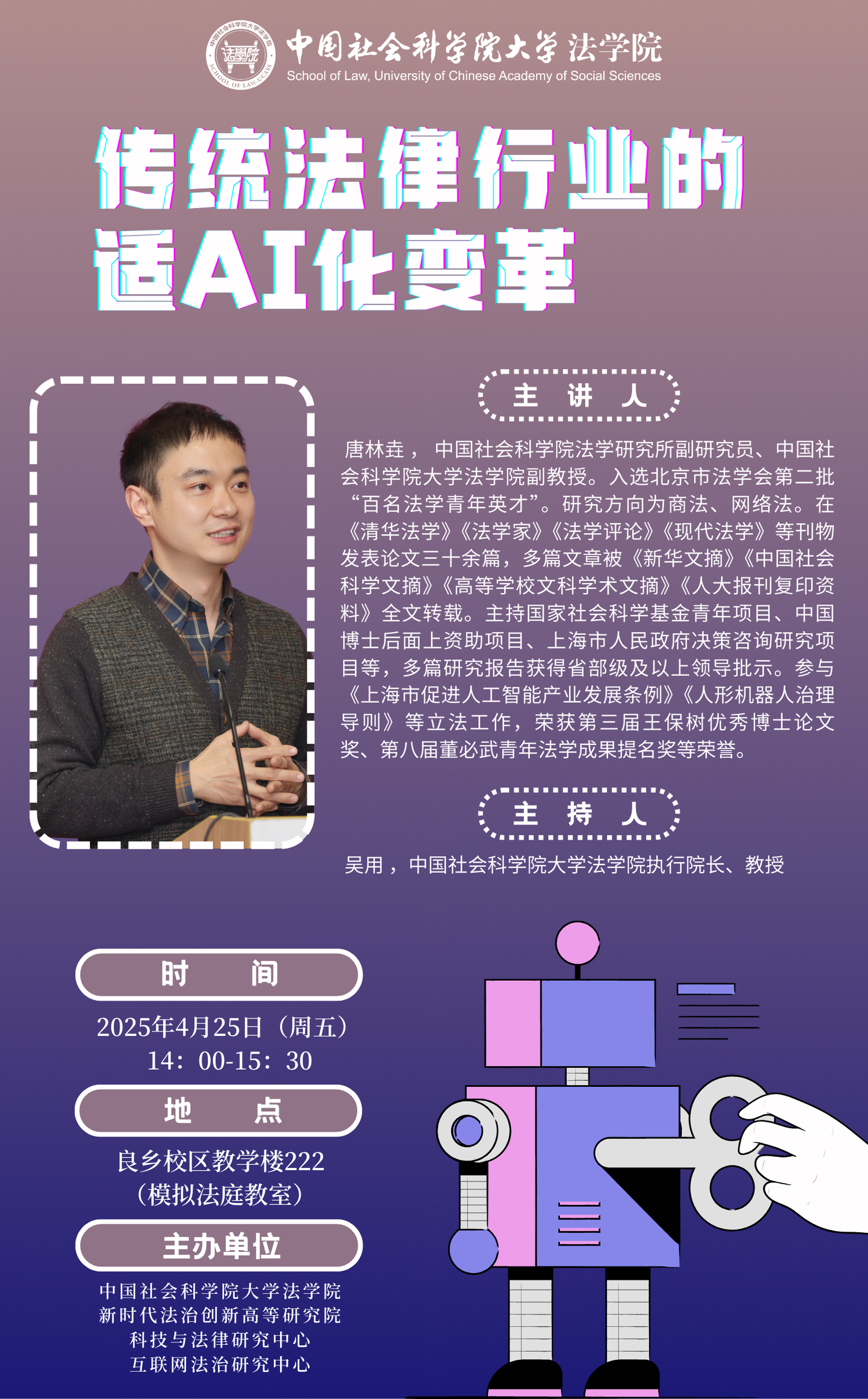 唐林垚,中国社会科学院法学研究所副研究员、中国社会科学院大学法学院副教授。入选北京市法学会第二批“百名法学青年英才”。研究方向为商法、网络法。在《清华法学》《法学家》《法学评论》《现代法学》等刊物发表论文三十余篇,多篇文章被《新华文摘》《中国社会科学文摘》《高等学校文科学术文摘》《人大报刊复印资料》全文转载。主持国家社会科学基金青年项目、中国博士后面上资助项目、上海市人民政府决策咨询研究项目等,多篇研究报告获得省部级及以上领导批示。参与《上海市促进人工智能产业发展条例》《人形机器人治理导则》等立法工作,荣获第三届王保树优秀博士论文奖、第八届董必武青年法学成果提名奖等荣誉。