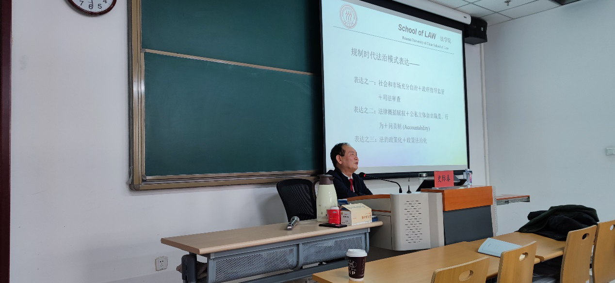2020年11月27日下午, 由中国社会科学院大学法学院、新时代法治创新高等研究院、中国社会科学院大学竞争法研究中心主办的中国社会科学院大学法学院名家讲座(第三期)暨中国社会科学院大学竞争法论坛(第三期)在中国社会科学院大学良乡校区本科生教学楼成功举行。我国著名经济法学家,中国人民大学法学院教授、安徽大学讲席教授、博士生导师史际春教授,就“规制时代的经济法解读”作主题讲座。讲座由法学院副院长柳建龙副教授担任主持,经济法教研室主任汤洁茵教授和谭袁副教授与谈。