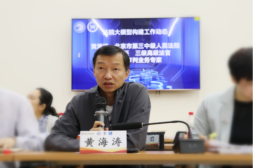 北京市第三中级人民法院审管办黄海涛主任的发言主题是“法院大模型构建工作”。黄主任以法院实践为出发点,介绍了与法学院系合作举办大模型展示会的喜人成果,探讨了大模型工具下的法律检索和传统法律检索的区别,提到自然语言处理的优势,以及训练材料精准性、“大模型幻觉”等现存问题;同时从提问方式、输出结果、媒体系统等方面介绍了专业法律模型与通用大模型之间的区别;最后提出我们仍未全面进入数字时代,无纸化、信息化、数据化、智能化和模型化应当分层递进,在当下应当加强司法实务部门与学校、与科研机构、科技公司的合作,推进技术进一步迭代,共同为数字司法贡献力量。