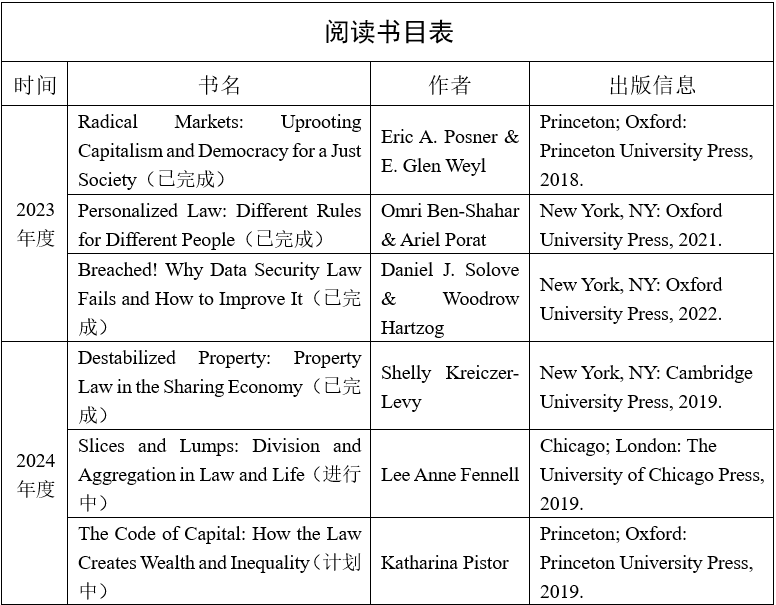 回溯到2023年3月15日,在互联网法治研究中心主任刘晓春老师的带领下,经过一系列筹备工作,中心读书小组举行了首次网络法英文文献读书会。2023年,读书小组共举行14次读书会,完成了三本英文著作的阅读(见下文“阅读书目表”)。期间,教务处曾针对读书会进行采访,详见报道: