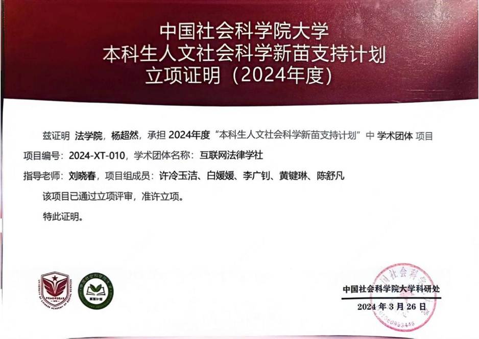 杨超然,中国社会科学院大学2022级本科生。2022年至今担任互联网法治研究中心研究助理。在校期间曾获得校级三等奖学、院级岳成奖学金、优秀共青团干部等荣誉。主持国家级挑战杯、省级大创项目、学校“新苗计划”等科研项目,荣获国家级挑战杯2024年度“揭榜挂帅”赛道一等奖等。论文获得“第六届新时代凯发登录入口的版权强国青年征文活动”二等奖、科技法治本硕博论坛优秀奖等。