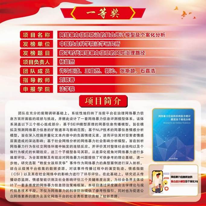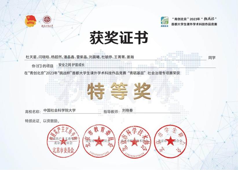 杜天星:我参与了涉网络未成年人保护系列研究工作并参与了相关调研,这些调研使我能够深入了解未成年人保护的现状和挑战。基于这些研究和调研经验,我以《安全之网 护苗成长》为题,参加北京市挑战杯基层治理专项赛,获得特等奖并成为该项目的擂主。该项目得到了赛事出题方北京市石景山检察院的采纳,我们也参与了后续的成果转化活动。此外,我还参与过个人信息保护公益诉讼、涉网络知识产权案例研究等项目。