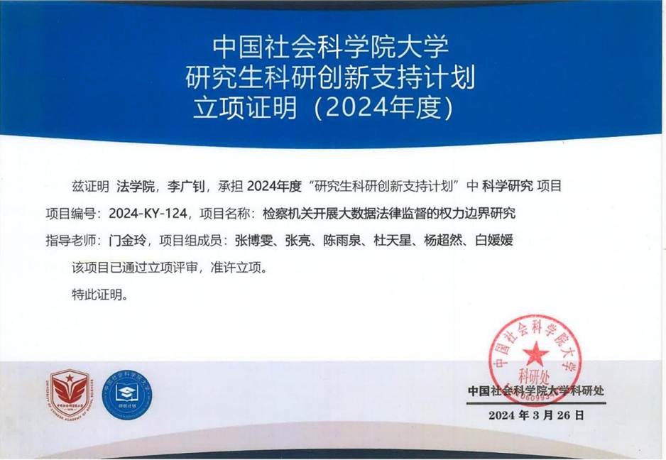 李广钊,中国社会科学院大学法学院2018级本科生、2022级硕士研究生,2018年至今担任互联网法治研究中心研究助理,2022年至今担任主任助理。在校期间获得国家奖学金,校级一等奖学金、优秀学生干部、优秀共青团干部、优秀共青团员,院级岳成奖学金、三好学生等荣誉。论文获得中国刑诉法学会刑辩专委会年会二等奖、科技法治本硕博论坛优秀奖和“京都杯”刑事法论文大赛二等奖等奖项。实践项目获得首都高校师生服务乡村振兴行动计划三等奖、学校知行社科二等奖等奖项。与老师合作在《少年儿童研究》《中国贸易报》等期刊和报刊发表文章6篇,参编著作1部,参与撰写《未成年人网络保护发展年度报告2024》等研究报告3部,在院刊《社科大法学》发表文章2篇。主持国家级大创项目、学校“新苗计划”“研创计划”等科研项目6个,参与国家社科基金项目、司法部科研项目、北京市法学会重点课题、学校学生科研项目等各类项目10余个。曾任班长、团支书、法学院研究生会副主席、校团委社会实践部副部长、社科大法学杂志社社长、校学生会办公室副主任等职务。曾在最高人民检察院、北京市检察院第四分院、字节跳动集团等单位实习,参加学校第五期“青马工程”培训并顺利结业。